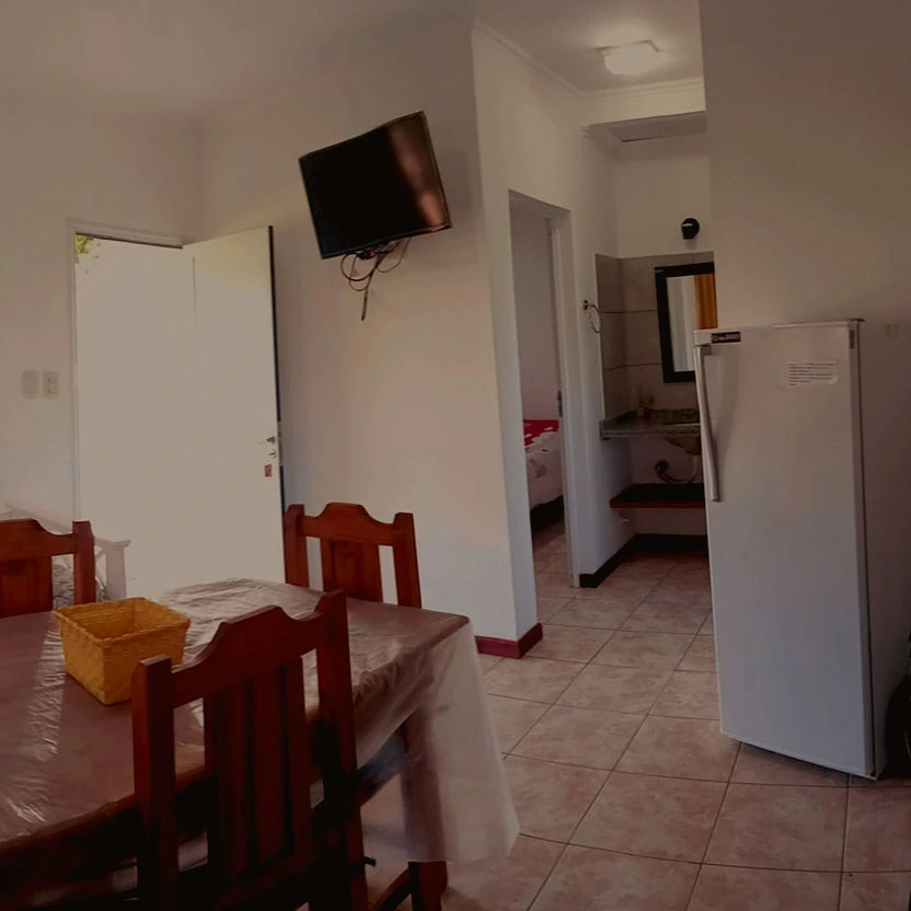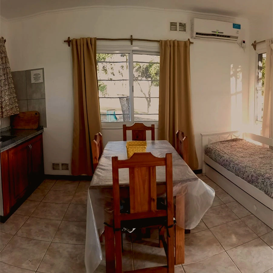 – Una cálida cocina-comedor, con AA, que cuenta con bajo mesada, alacena, artefacto cocina con horno, heladera, mesa, sillas ideal para compartir momentos inolvidables con seres queridos, incluye un sillón cama.